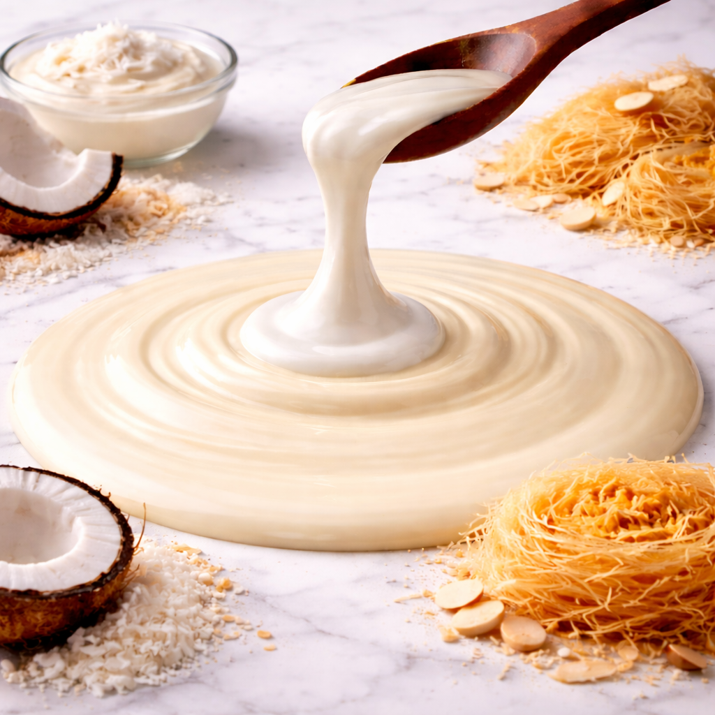Hier vereinen sich feinste weiße Schokolade und eine cremige Kokosfüllung, verfeinert mit geröstetem Kadayif, liebevoll verarbeitet. Die süße, zarte Schokolade harmoniert perfekt mit der exotischen Kokosnote und der knusprigen Textur des Kadayif, die dem Block eine elegante Tiefe und ein tropisch-orientalisches Aroma verleiht, ohne den cremigen Schokoladengeschmack zu überdecken.