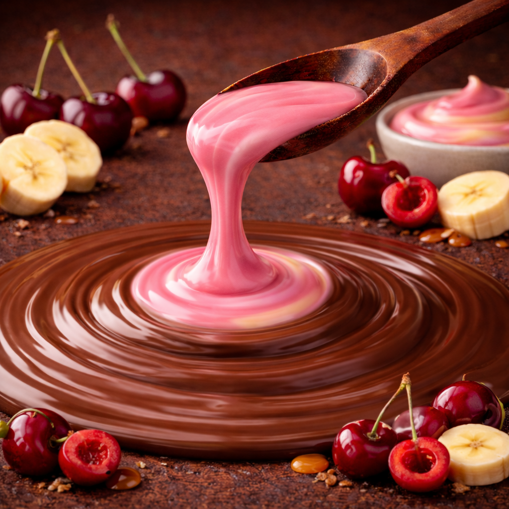 Im Inneren der 100-g-Tafel befinden sich zwölf pralinenähnliche Kammern im Verbund, jede einzelne gefüllt mit dieser samtigen Kirsch-Banane-Creme. Die Vollmilchschokolade bringt Wärme und Tiefe, während die fruchtige Füllung für Frische und Verspieltheit sorgt – harmonisch, rund und angenehm cremig bis zum letzten Stück.