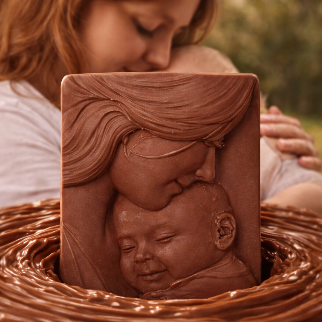 Die sanfte Vollmilch- oder die intensiv-herbe Zartbitterschokolade harmoniert mit der innigen Darstellung des Motivs und macht diese Schokolade zu einem besonderen Genussmoment, bei dem Geschmack und emotionale Botschaft harmonisch zusammenkommen, ohne den charaktervollen Schokoladengeschmack zu überlagern.