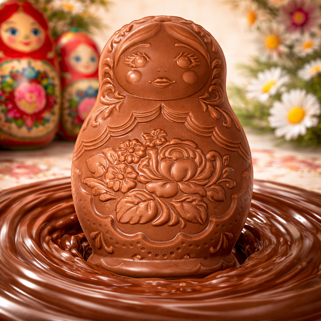 Die sanfte Vollmilch- oder die intensiv-herbe Zartbitterschokolade harmoniert mit dem detailreichen Matrjoschka-Motiv und macht diese Schokolade zu einem besonderen Genussmoment, bei dem Geschmack und ästhetische Symbolik harmonisch zusammenkommen, ohne den charaktervollen Schokoladengeschmack zu überlagern.