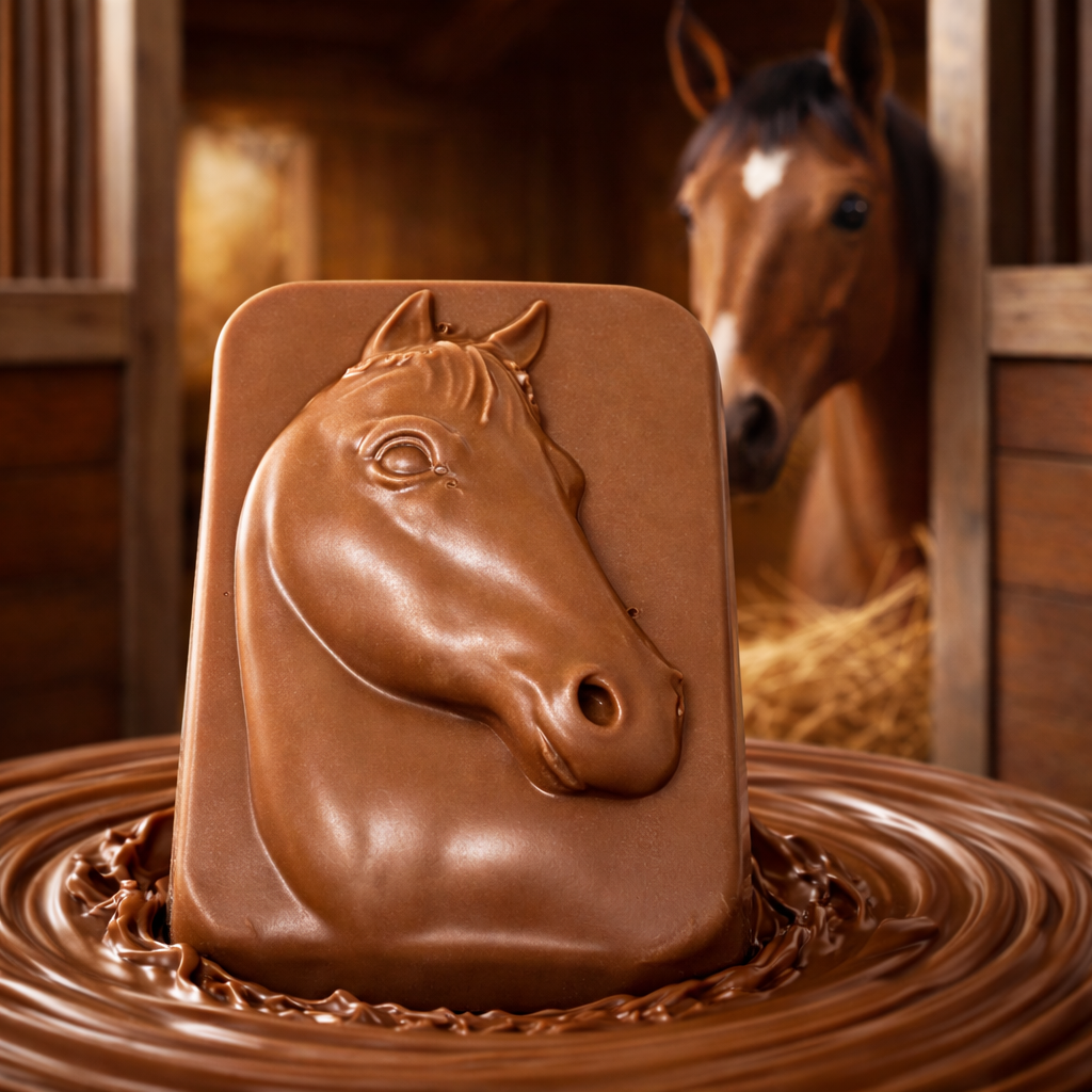 Die sanfte Vollmilch- oder die intensiv-herbe Zartbitterschokolade harmoniert mit der dynamischen Darstellung des Pferdes und macht diese Schokolade zu einem besonderen Genussmoment, bei dem Geschmack, Symbolkraft und Eleganz harmonisch zusammenkommen, ohne den charaktervollen Schokoladengeschmack zu überlagern.