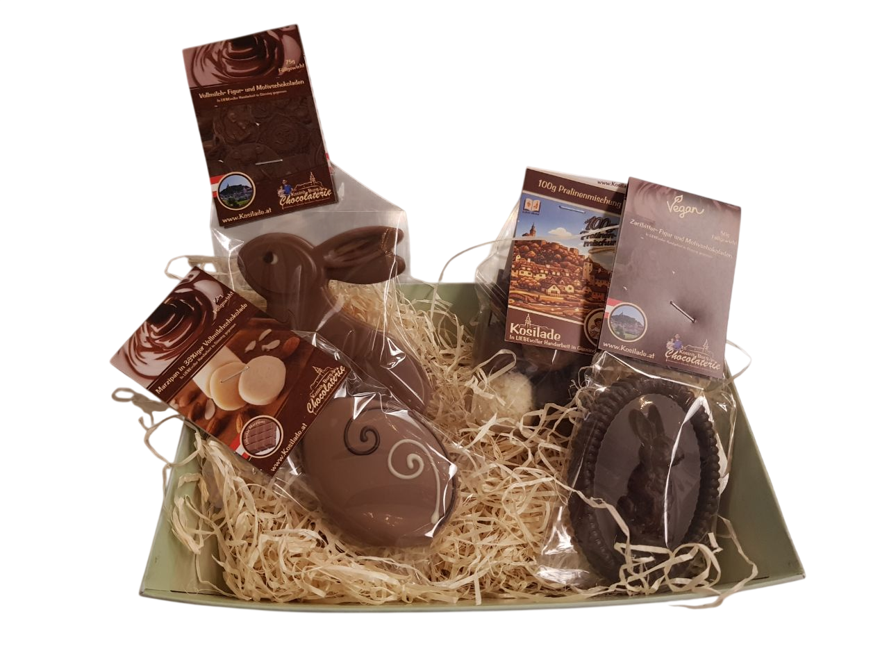 Wie all unsere Produkte wird auch diese Kombination in unserer kleinen familiengeführten Chocolaterie in Güssing mit viel Sorgfalt und echter Handarbeit gefertigt. Jedes einzelne Element entsteht bewusst und wird anschließend zu dieser vielseitigen Oster-Kombi zusammengestellt.