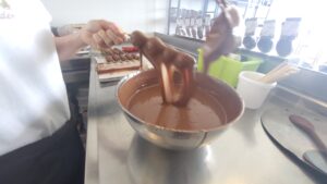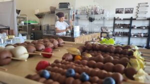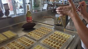 Die Produktion befindet sich in den selben Räumlichkeiten, wie auch der Verkaufsraum und ist somit während der Öffnungszeiten für Kunden einsehbar. Hinter Scheiben kann man hier zuschauen, wie die Schokoladen kreiert, verfeinert, gegossen und eingepackt werden.